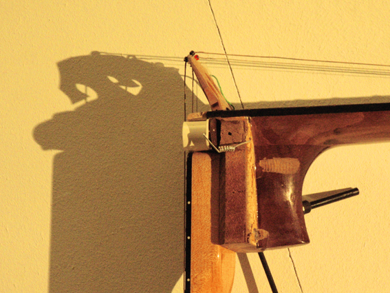 0 Comments Published by Administrator August 25th, 2008 in design, soundDuring the 10 x10 -> 11 days in cabaret voltaire I was able to make a bass that has a flexible body and a fixed foot where it can stand on. It sounds very deep and warm through the pick-up element from a guitar. The bass is made out of a bed slat base lying around in the magnusstreet in Zürich. Have a look at the picture.